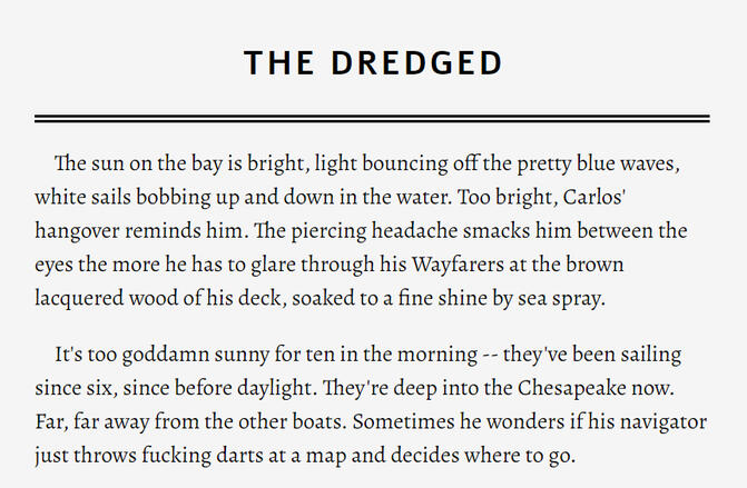 The sun on the bay is bright, light bouncing off the pretty blue waves, white sails bobbing up and down in the water, the ocean and sky the same shade of cornflower. Too bright, Carlos' hangover reminds him. Too damn sunny for ten in the morning. The piercing headache smacks him between the eyes. The more he has to glare through his Wayfarers at the lacquered wood of his deck, soaked to a fine shine by sea spray the worse it gets. Wet, cold, and miserable. Same shit, different day.They've been sailing since six, since before daylight. They're deep into the Chesapeake now, far, far away from the other boats. Carlos will keep sailing until the one other person on his ancient fishing trawler tells him to stop, which could be now, and could be four hours from now. Sometimes he wonders if his navigator throws darts at a map and decides where to go.The hand that thumps between his shoulder blades nearly makes him hurl. He can feel the bruise starting to settle beneath his skin, moving into the neighborhood with all the others.Speak of the devil.Rubbing his aching spine (aching everything — his whole body just hurts) he turns. Simon grins. Sometimes he reminds Carlos of a shark — all teeth.Most times he draws a comparative line that's closer to seagull.”I'm dropping the net — should be some good schools around here somewheres.“ Somewheres. Carlos just stares at him. Not just because he talks so loud it makes Carlos want to kill himself — the fake Curtis Bay lexicon Simon puts on is grating. Simon isn't even from Baltimore -- as far as Carlos knows, Simon isn't American, his accent completely unplaceable. Carlos has grown up here his whole life, and he still doesn't say somewheres.”Great,“ and that's Carlos’ whole reply, focusing on driving the boat and trying not to throw up. Simon flashes him a two-finger salute before he grabs the net. It's heavy, weighted, black braided nylon. He loops the half hitches like a machine, dragging lengths of damp, limp cord. It thumps in tandem with Carlos' headache.Simon was the one who woke him in a hurry this morning. Something about “feeling good about today's catch.” Like he had the right after keeping Carlos out so late the night before, dragging him up and down Fells Point. He never knocks, either -- always from the window. Carlos is pretty sure he threw his bedside clock at him when he saw the time, and then -- fool that he is -- he threw on the first pair of shoes and boating shorts he could find in his pile of unlaundered clothes, because Simon is never wrong. In terms of fish, anyway.Annoying as he is, Simon is an invaluable employee. Not many grown men could handle a net that heavy by their lonesome — Carlos can barely do it, and this boat is like an older brother to him. He's got a sixth sense for where the fish go and where the currents carry them — and for trouble. Carlos only half-regrets fishing him out of the ocean.