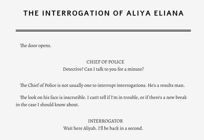 (Aliyah sits in the center of the screen, with the Chief of Police off to the side.)INTERROGATOR